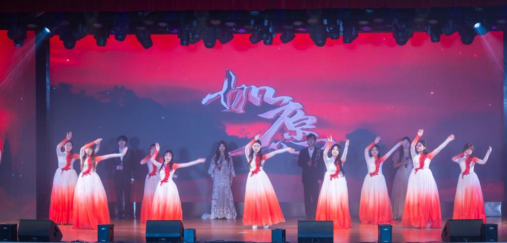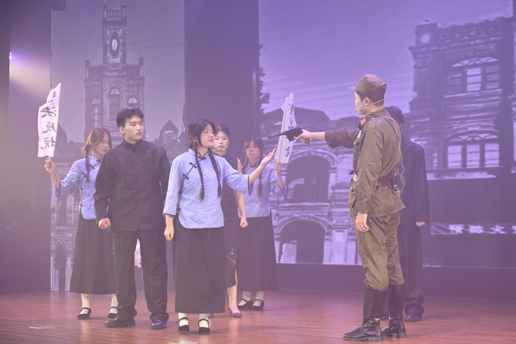 第三篇章“砺学笃行 勇毅前行”中,话剧《破晓》深情演绎了爱国青年们挺身而出、奋起抗争、奔走呐喊、振臂高呼的青春热血;舞蹈《民族团结一家亲》以多元舞姿展现各民族学子同心筑梦,体现铸牢中华民族共同体意识、推进中华民族共同体建设教育实践成果。