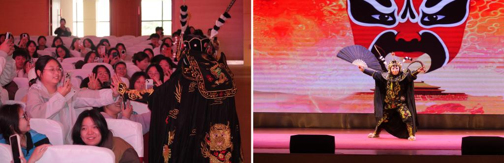 在互动教学环节,演职人员现场示范戏曲台步、手势等基础技巧,学生积极参与实践,直观感受戏曲程式之美。
