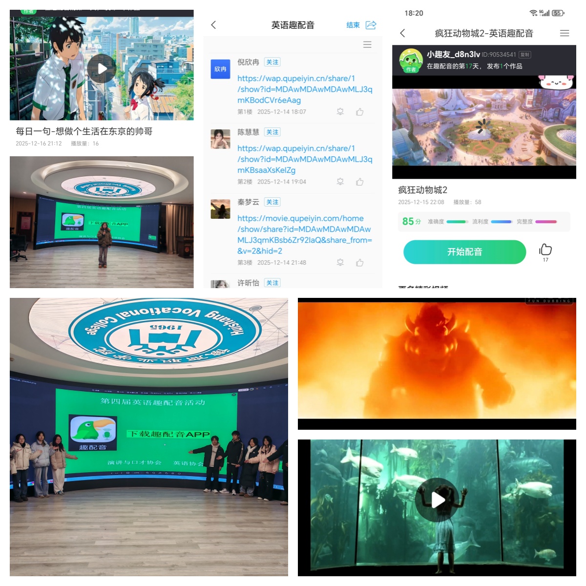 同期开展的第四届英语趣配音活动以“趣味赋能英语学习”为理念,同样收获了同学们的广泛好评与积极参与。活动中,同学们通过“趣配音APP”,自主选取英文动画、经典电影片段、知名英文演讲等丰富素材进行配音。鲜活有趣的内容、便捷高效的参与方式,让同学们饶有兴致地投入其中。在模仿标准英文发音、把控语言节奏、诠释角色情感的过程中,同学们不仅有效提升了英语口语表达能力,拓宽了国际文化视野,更真切感受到了英语语言的独特魅力,在趣味实践中扎实夯实了英语核心素养。